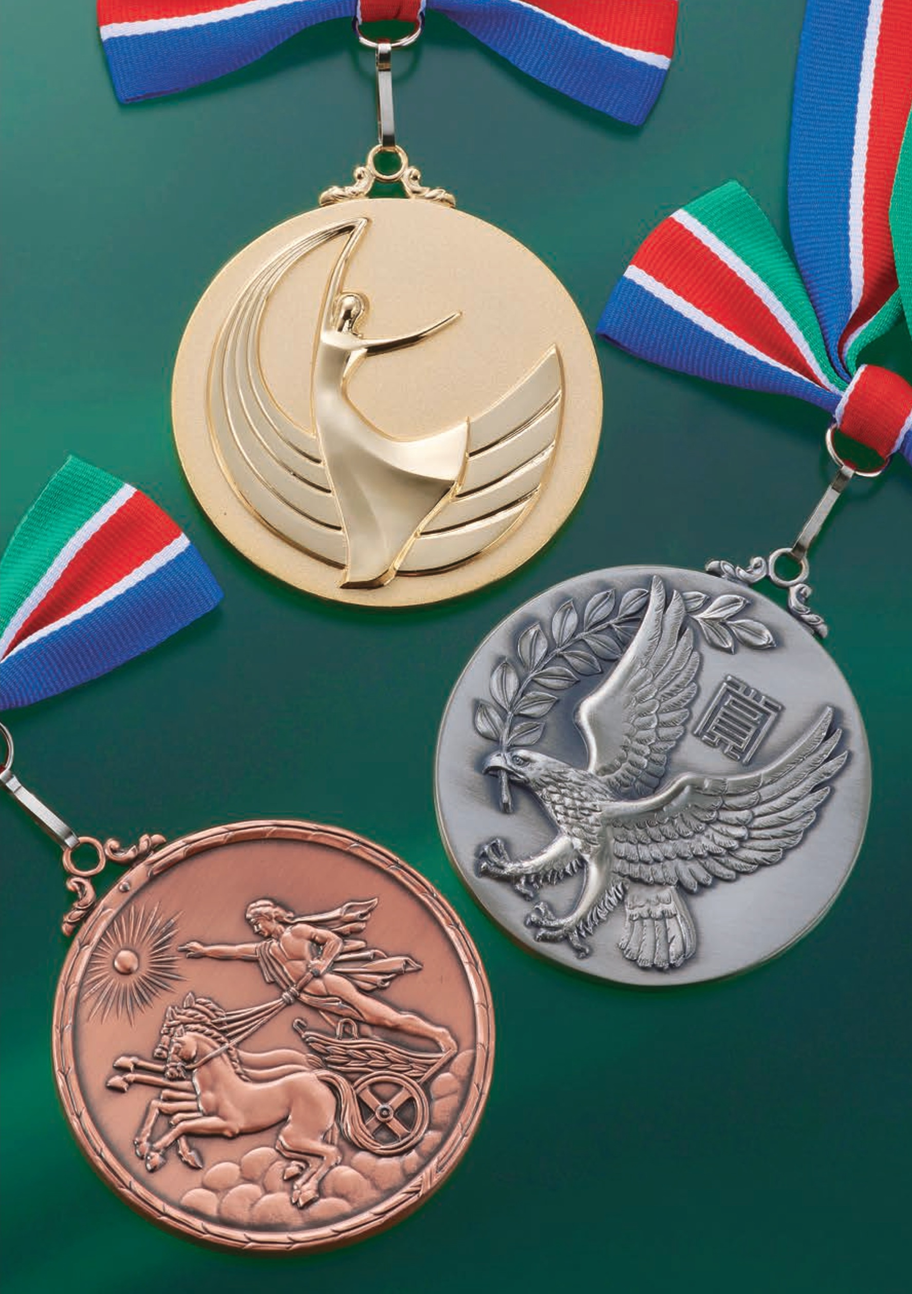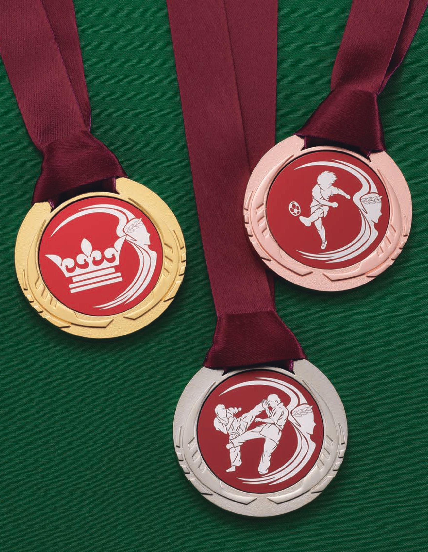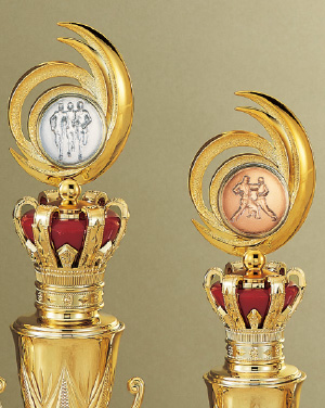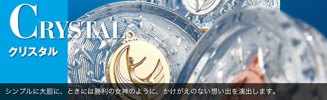 従来の人形ではなく、競技別のメダルを装着するスタイリシュなトロフィーが登場。大きさだだけでなく金、銀、銅と順位に合わせて色が選べるモデルを多数取りそろえています。