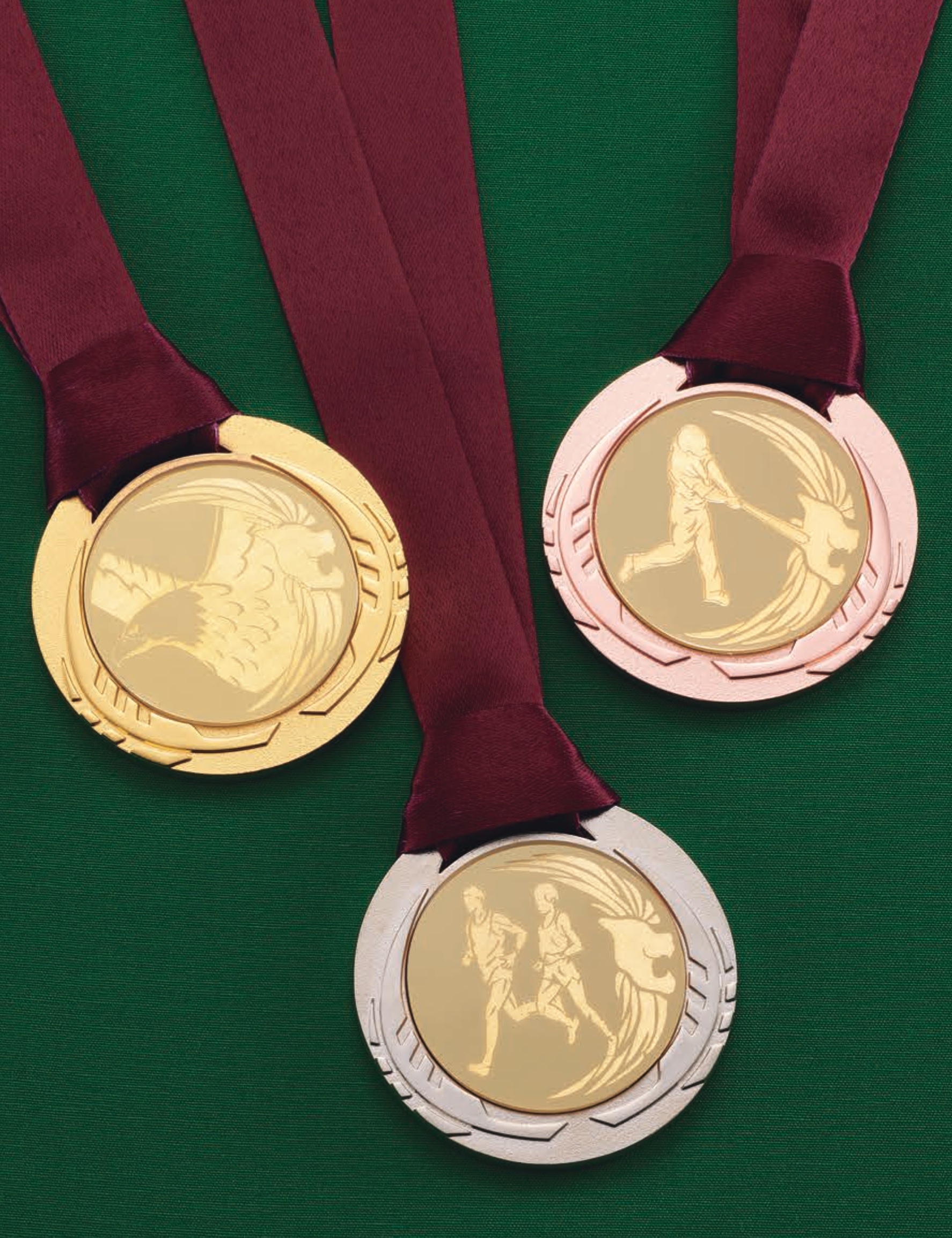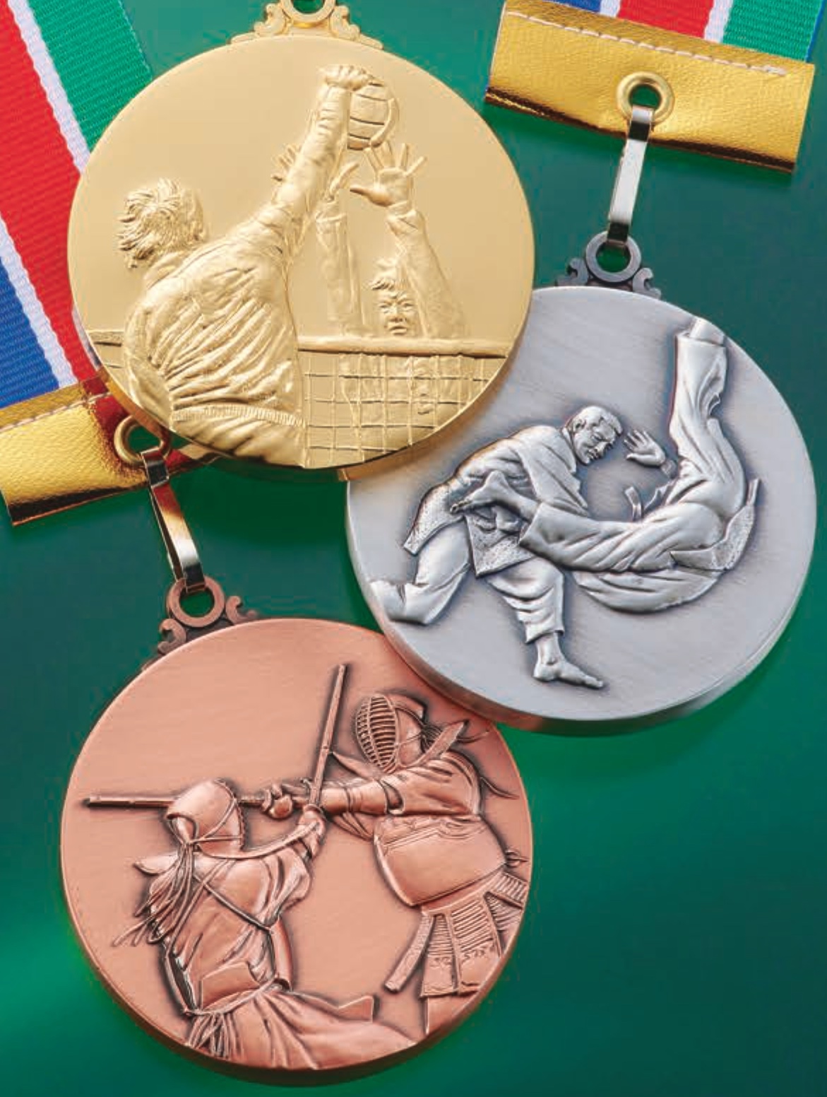 従来の人形ではなく、競技別のメダルを装着するスタイリシュなトロフィーが登場。大きさだだけでなく金、銀、銅と順位に合わせて色が選べるモデルを多数取りそろえています。